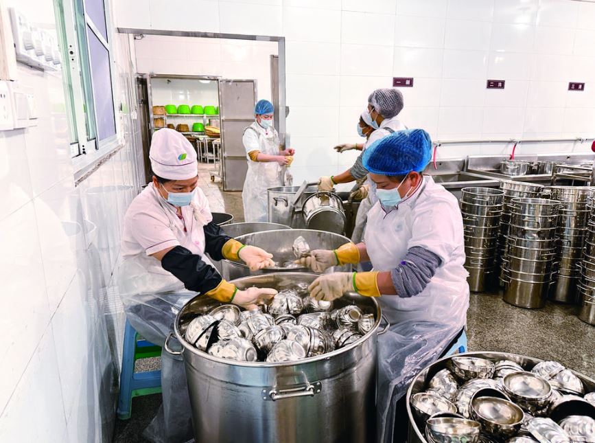 学校食堂内一派忙碌有序的景象。工作人员按照流程分组作业,对餐盘、碗筷、饭桶等餐具进行分类清洗、高温消毒;各类食堂物资已陆续配送到位,工作人员与供货商协同配合,规范完成物资搬运、登记入库、标注日期等工作,严把食品安全关与物资管理关。